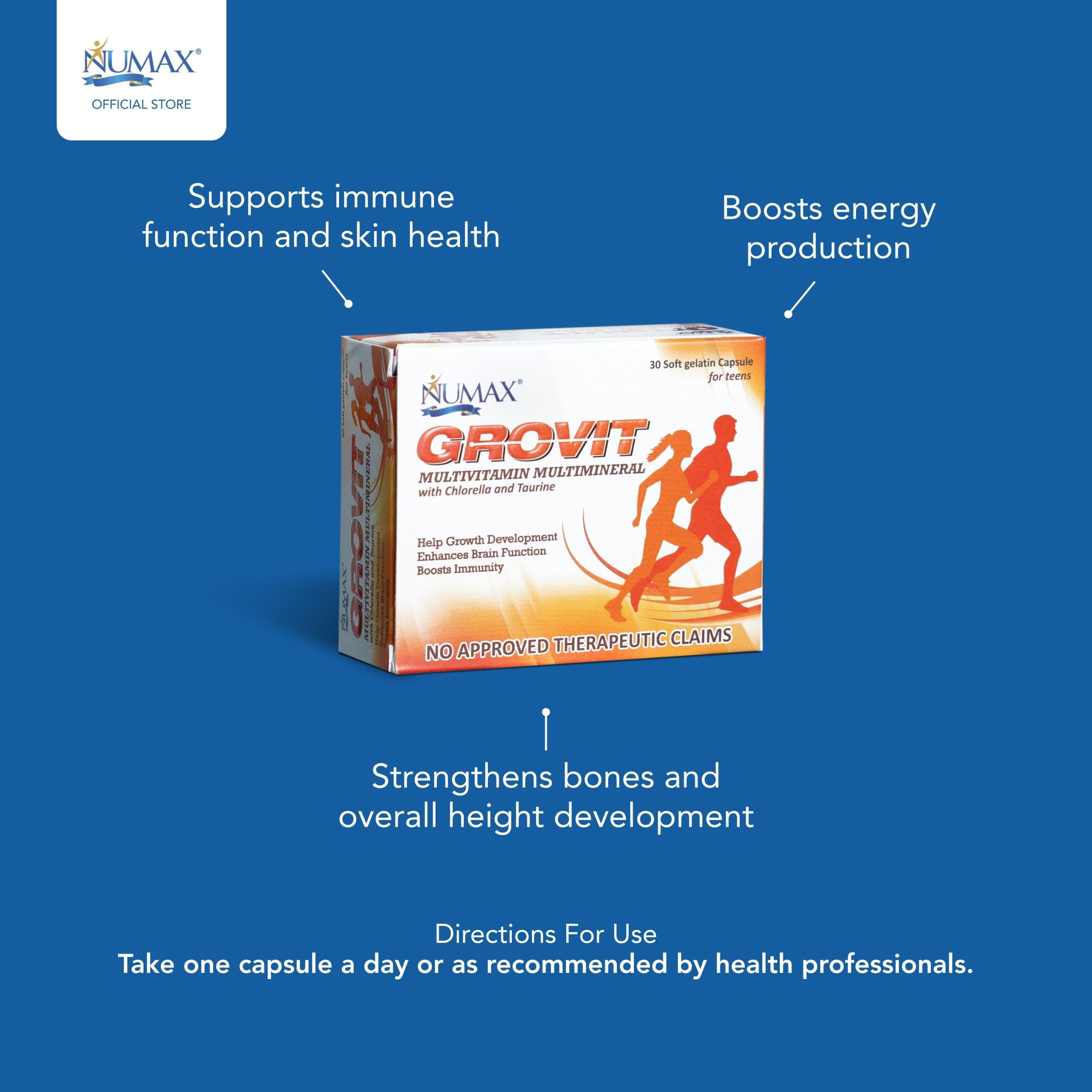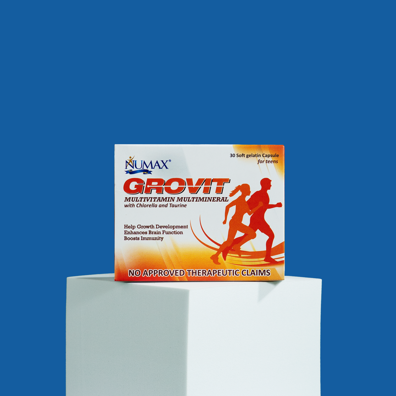 Overall Description: Numax Grovit is a powerful, all-in-one supplement designed to support overall health, boost energy levels, and promote physical and mental well-being. This comprehensive formula combines a variety of essential vitamins, minerals, and botanicals for enhanced cognitive function. This also provides key support for immune function, skin health, bone strength, and energy production. Additionally, Grovit contains vital nutrients that play a role in bone development and overall growth. With consistent use, the rich combination of vitamins and nutrients can potentially accelerate the process of growing taller, especially during the critical growth periods of adolescence. Grovit helps strengthen bones, improve bone density, and may support overall height development, making it a great choice for those looking to maximize their growth potential. This holistic blend provides not only overall health benefits but also a special edge for those aiming to grow taller faster and healthier.