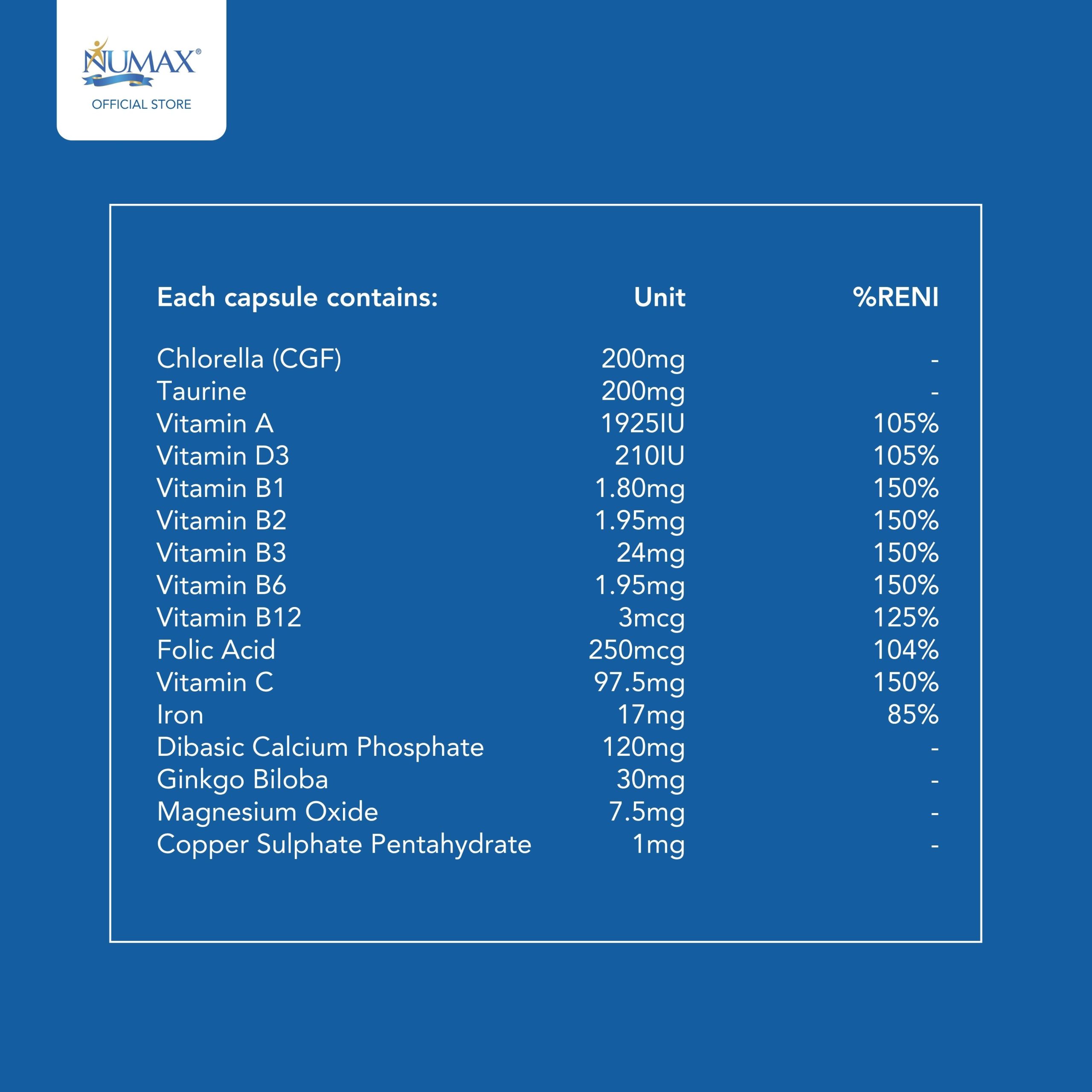 Ingredients: Chlorella, Taurine, Vitamin A (Retinyl Palmitate), Vitamin D3 (Cholecalciferol), Vitamin B1 (Thiamine Mononitrate), Vitamin B2 (Riboflavin), Vitamin B3 (Niacinamide), Vitamin B6 (Pyridoxine Hydrochloride), Vitamin B12 (Cyanocobalamin), Folic Acid, Vitamin C (L-Ascorbic Acid), Iron (Ferrous Fumarate), Dibasic Calcium Phosphate, Gingko Biloba (Ginsenoside 10%), Magnesium Oxide, Copper Sulphate Pentahydrate
